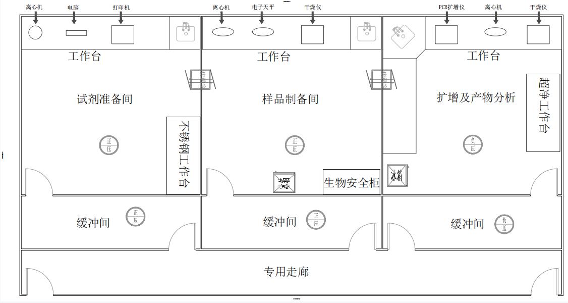 將PCR過程分成試劑準備、標本制備和PCR擴增區及產物分析檢測區四個獨立的試驗區。整個區域有一個整體緩沖走廊。每個獨立試驗區設置有緩沖區,同時各區通過氣壓調節,使整個PCR實驗過程中試劑和標本免受氣溶膠的污染并降低擴增產物對人員和環境的污染。