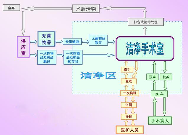 基本原則:功能流程短捷,潔污分明。嚴(yán)格區(qū)分潔凈區(qū)與非潔凈區(qū);根據(jù)需要,合理安排手術(shù)室與輔助用房;人、物流程清晰、順暢;潔污分流,無交叉污染。